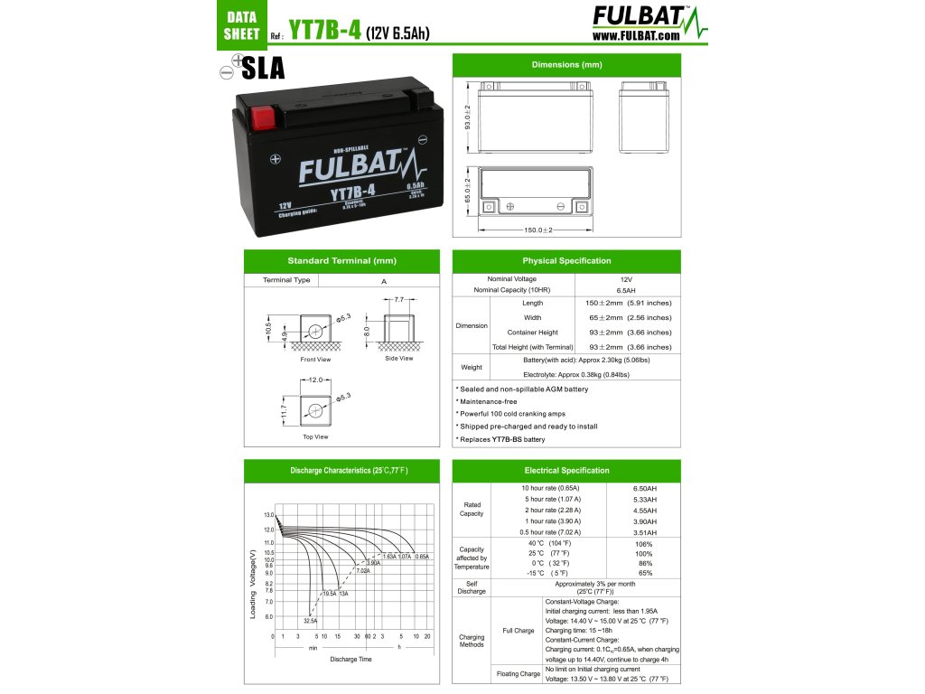 Bezúdržbová baterie Fulbat FT7B-4, 12V. Rozměry baterky jsou 93x150x65mm. Hmotnost baterky s kyselinou je 2,46kg. Baterie má kapacitu 6,5Ah.Doplňkové parametry