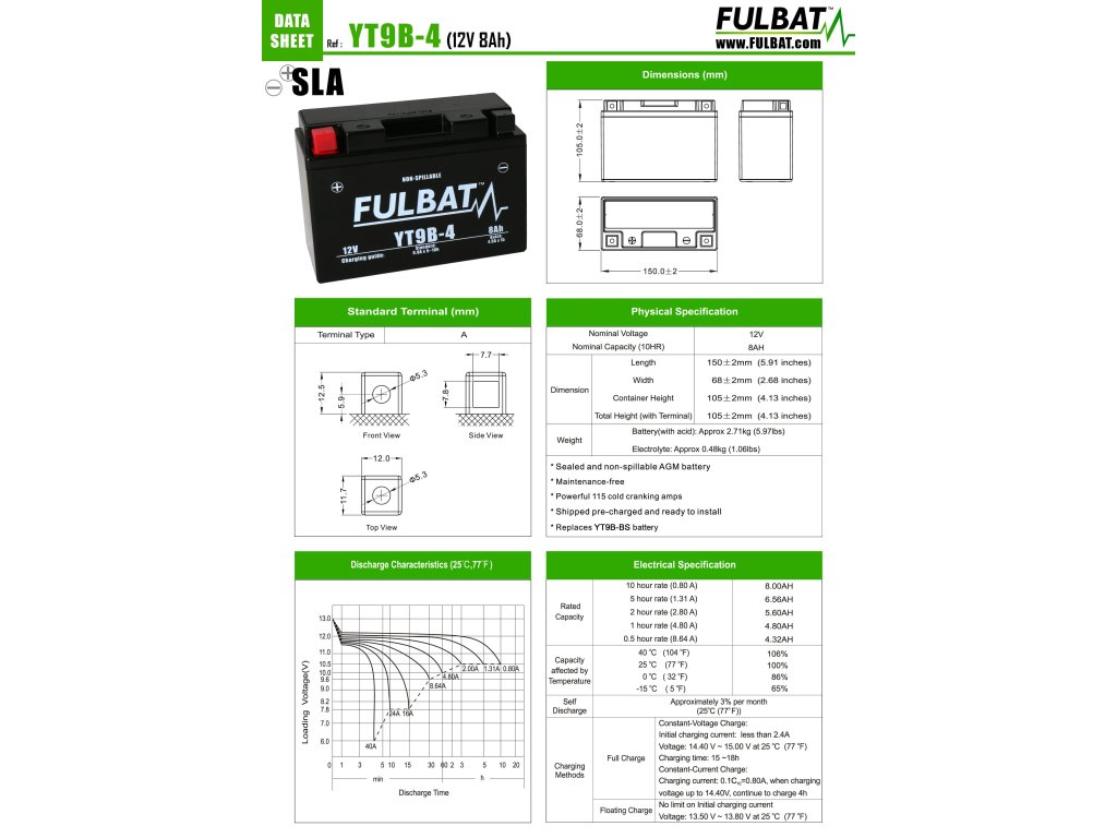 Bezúdržbová gelová 12V baterie od firmy Fulbat. Rozměry baterky jsou 150x68x105mm. Hmotnost baterky je 2,95kg. Baterie má kapacitu 8Ah. Jedná se o gelovou baterii a je potřeba mít i nabíječku, která je určená pro gelové baterie. Lze použít jako alternativa za baterie YUASA YT9B-BS, JM YT9-B4, GS GT9-B4Doplňkové parametry