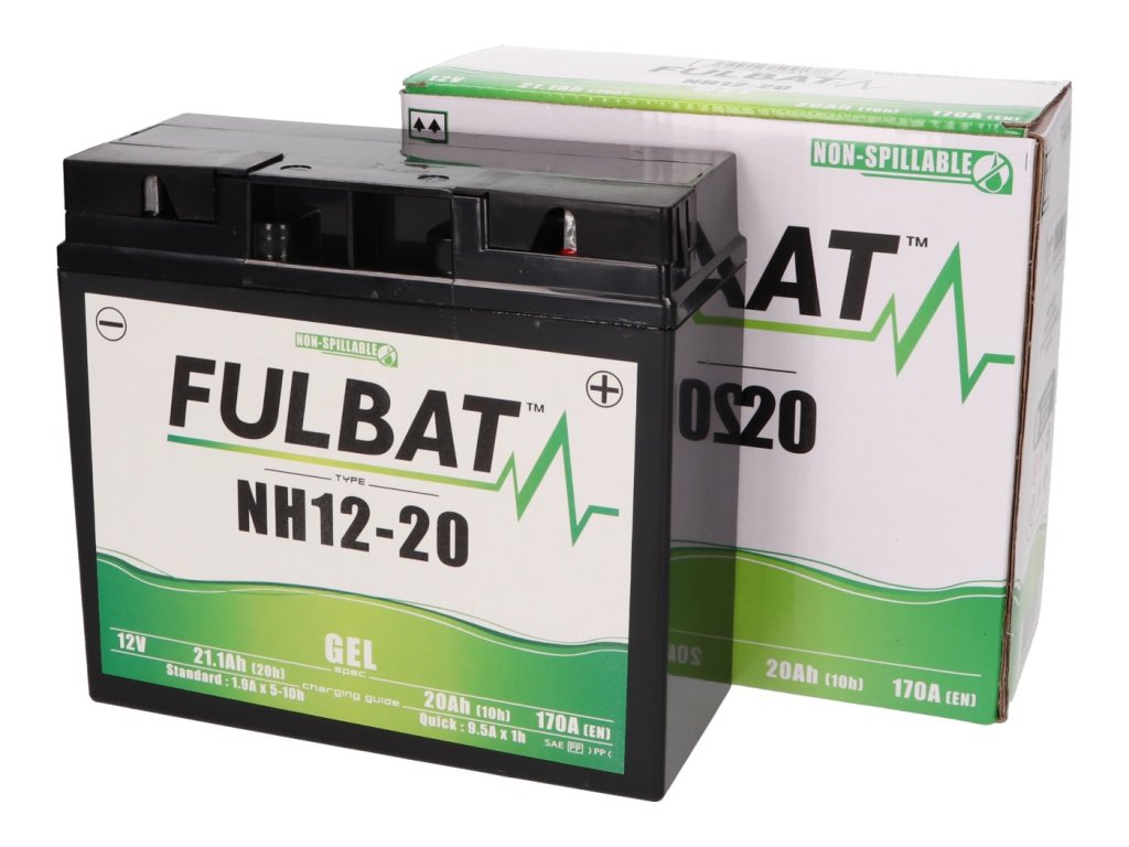Bezúdržbová a gelová baterie Fulbat NH12-20, 12V. Rozměry baterky jsou 168x182x77mm. Hmotnost baterky je 5.4kg. Baterie má kapacitu 20Ah.