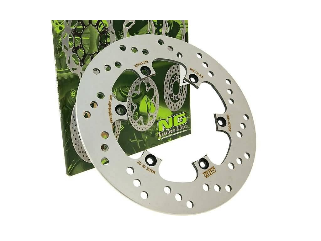 Brzdový kotouč od známého španělského výrobce NG Brake Disc, který už více než 20 let vyrábí brzdové kotouče pro motocykly, skútry a čtyřkolky. Jako jeden z mála výrobců mají všechny standardní NG kotouče homologované a díky tomu jsou ideální kvalitní náhradou za drahý originální díl. Více než 30 renomovaných evropských a japonských výrobců spolehají na špičkovou kvalitu NG brzdových kotoučů a montují je do nově vyrobených vozidel jako originální díl. Pasuje na Aprilia MX 50 r.v. 04 (zadní) / Pegaso 50 r.v. 92-05 (zadní) / RX 50 92-05 (zadní), Beta Jonathan 125 r.v. 99-02 (zadní) / ALP 200 r.v. 06 (zadní) / Euro 350 r.v. 99-05 (zadní) / Jonathan 350 r.v. 02-03 (zadní) / VCM 350 4T r.v. 01 (zadní) / ALP 4.0 r.v. 03-06 (zadní) / Motard 4.0 r.v. 06 (zadní). Homologace: Ano / Průměr kotouče: 220mm / Průměr umístění děr: 110mm / Tloušťka kotouče: 4,0mm / Počet děr: 6 / Vnitřní průměr díry pro šroub: 6,5mm / Typ: StandardDoplňkové parametry