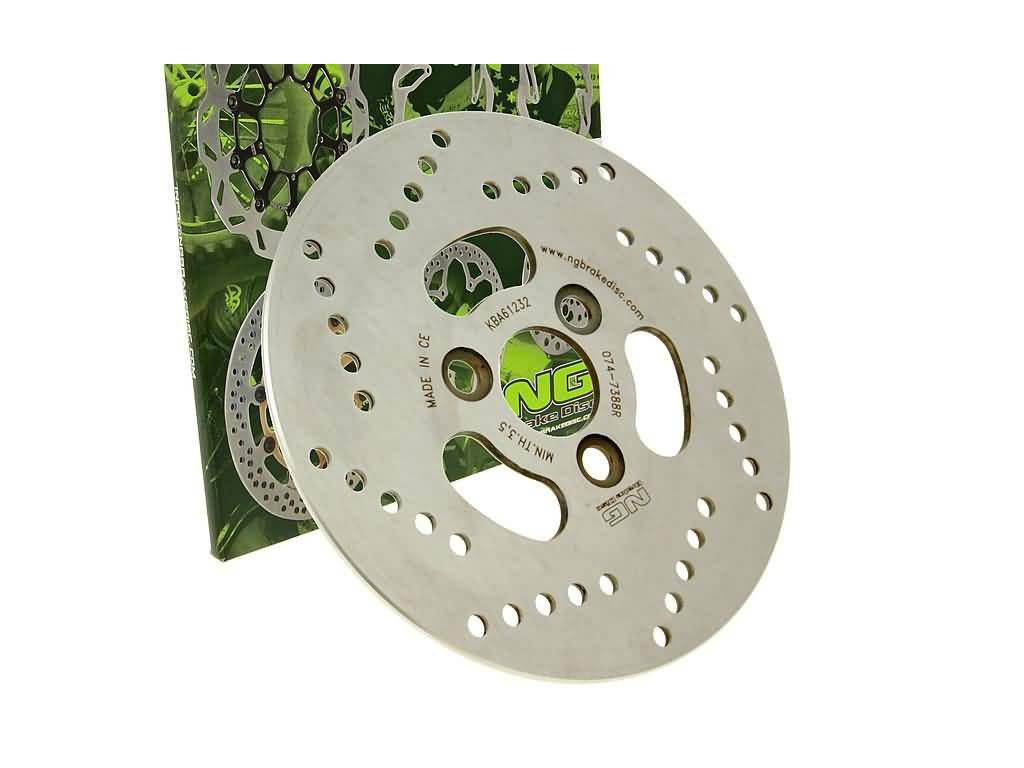 Brzdový kotouč od známého španělského výrobce NG Brake Disc, který už více než 20 let vyrábí brzdové kotouče pro motocykly, skútry a čtyřkolky. Jako jeden z mála výrobců mají všechny standardní NG kotouče homologované a díky tomu jsou ideální kvalitní náhradou za drahý originální díl. Více než 30 renomovaných evropských a japonských výrobců spolehají na špičkovou kvalitu NG brzdových kotoučů a montují je do nově vyrobených vozidel jako originální díl. Pasuje na Rieju First 50 r.v. 96 (přední), Suzuki Address R 50 r.v. 95-02 (přední) / Address R7 50 r.v. 96-98 (přední) / Address RF 50 r.v. 96-99 (přední) / Estilete 50 r.v. 00-02 (přední) / Katana 50 r.v. 97-03 (přední) / Katana 50 Racing r.v. 98-02 (přední) / Katana 50 Replica Movistar r.v. 01-02 (přední) / Katana 50 W r.v. 99-03 (přední) / Zillion UX 50 r.v. 99-03 (přední) / Address AH 100 (přední) / Hocuto 110 r.v. 00-03 (přední). Homologace: Ano / Průměr kotouče: 180mm / Průměr umístění děr: 34mm / Tloušťka kotouče: 4,0mm / Počet děr: 3 / Vnitřní průměr díry pro šroub: 10,5mm / Typ: StandardDoplňkové parametry