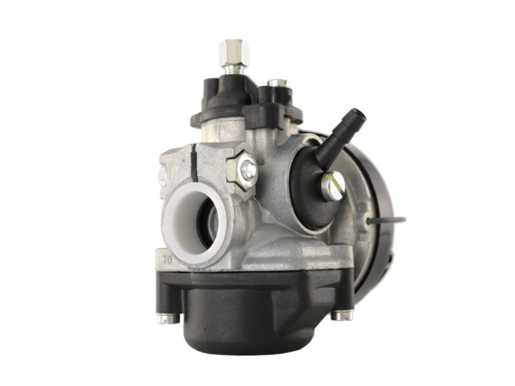 Dellorto tuningový karburátor pro moped 50 až 70 ccm s přímým vzduchovým filtrem, krátkou sací cestou pro vysoce otáčkové motory a ručním sytičem, součástí kovový filtr.