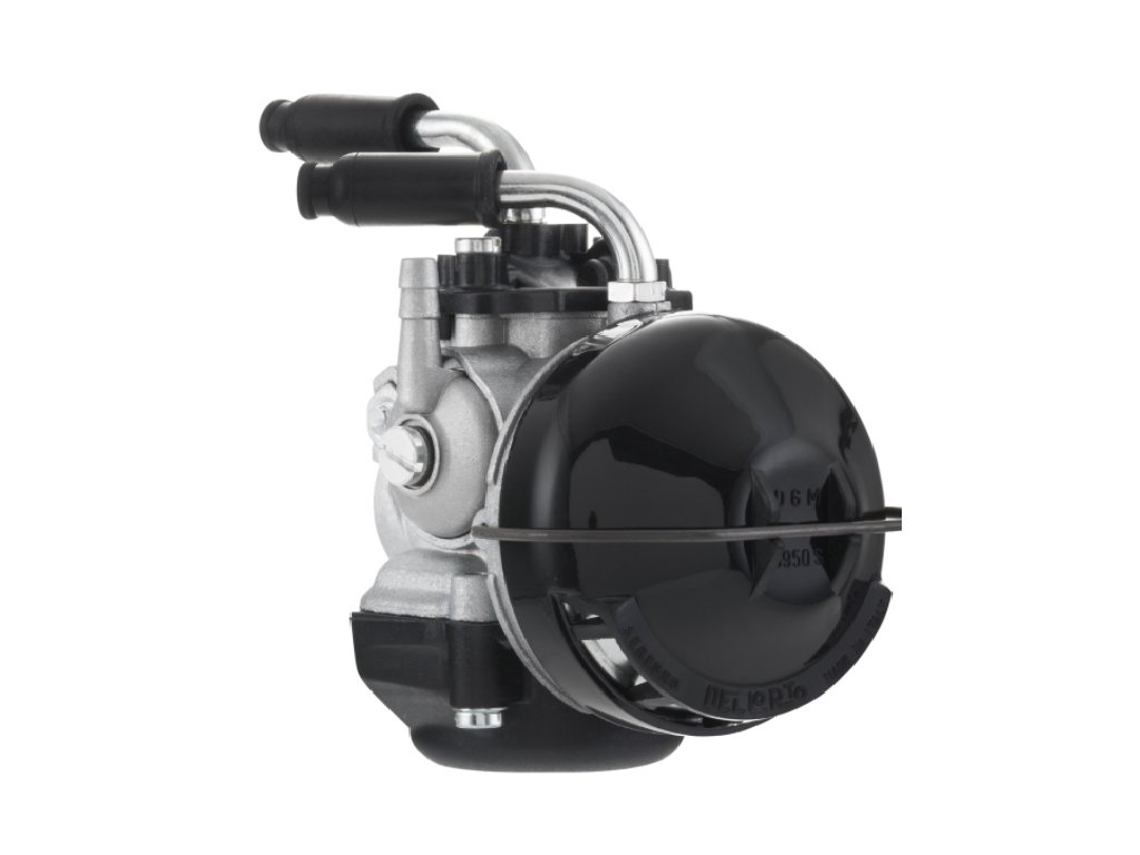 Dellorto tuningový karburátor pro mofa, kompaktní s zalomeným připojením lanka, krátká sací cesta pro vysoké otáčky, ruční sytič, bez vzduchového filtru.