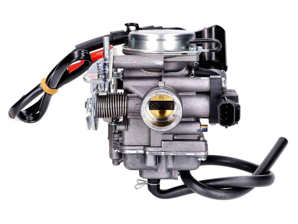 Kompletní náhradní karburátor včetně elektrického zařízení pro studený start (sytič) a snímače polohy škrticí klapky vhodný pro čtyřtaktní skútry Euro 4. Karburátorem jsou standardně vybaveny čtyřtaktní modely SYM 12" o objemu 50 cm3 s rychlostí 25 km/h a 45 km/h vyrobené v letech 2018 až 2020 a mnoho novějších čínských skútrů z výroby.