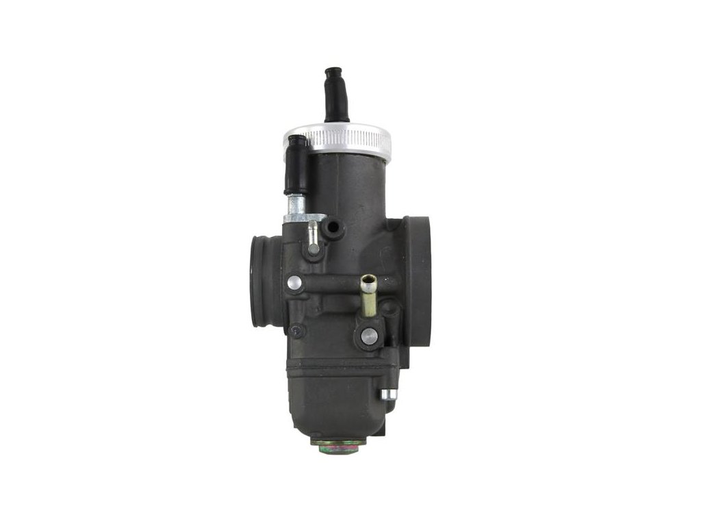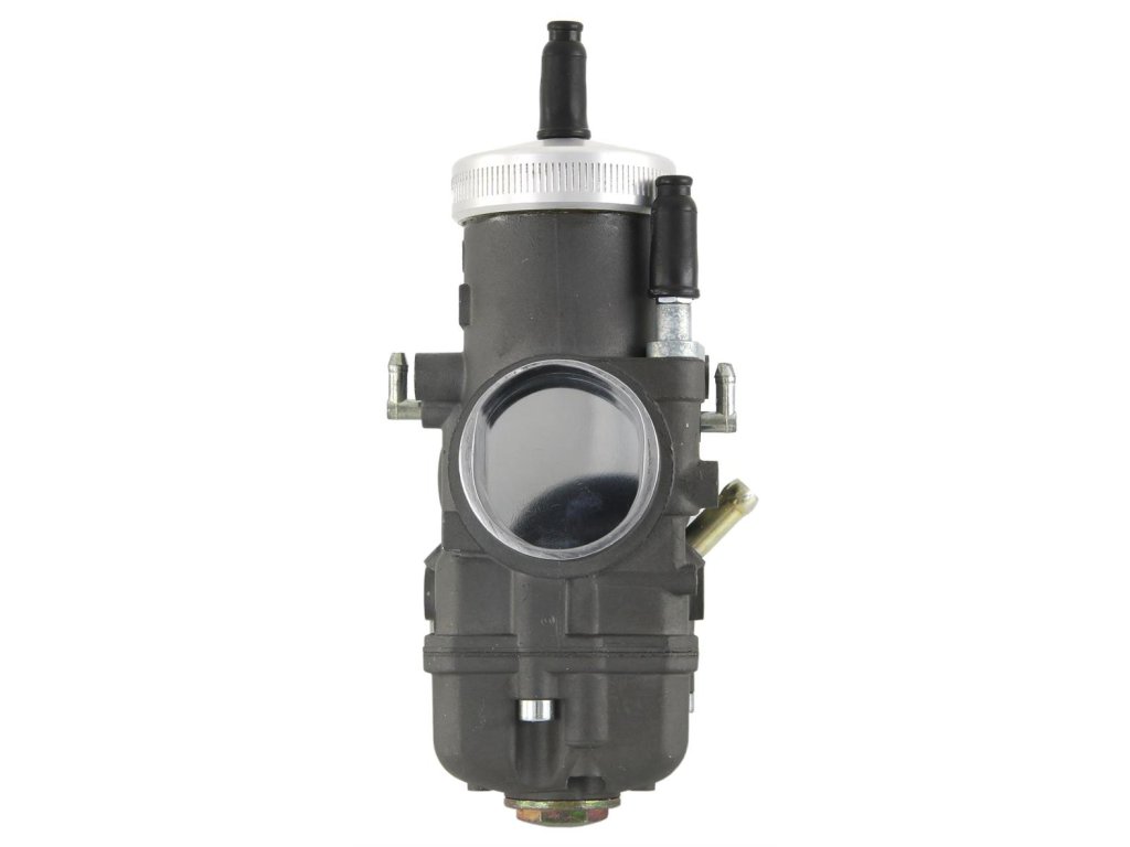 Dellorto tuningový karburátor pro moped 50 až 70 ccm s přímým vzduchovým filtrem, krátkou sací cestou pro vysoce otáčkové motory a ručním sytičem, součástí kovový filtr.