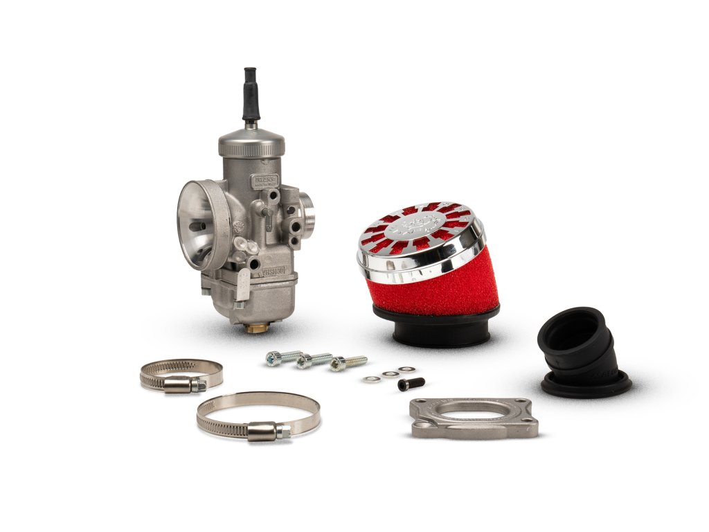 Tuningová sada karburátoru pro Puch Maxi Mofa a moped. Obsahuje karburátor repliku, přírubu, vzduchový filtr a gumu vzduchového filtru.