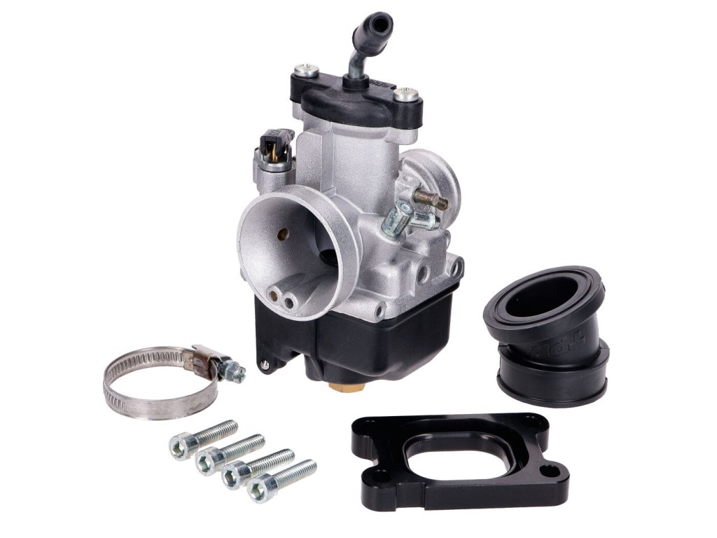 Karburátor Dellorto VHST 28 mm má páčkový sytič. Příruba je 360° nastavitelná pro dosažení optimálního umístění. Sací mezikus je z kovu.
