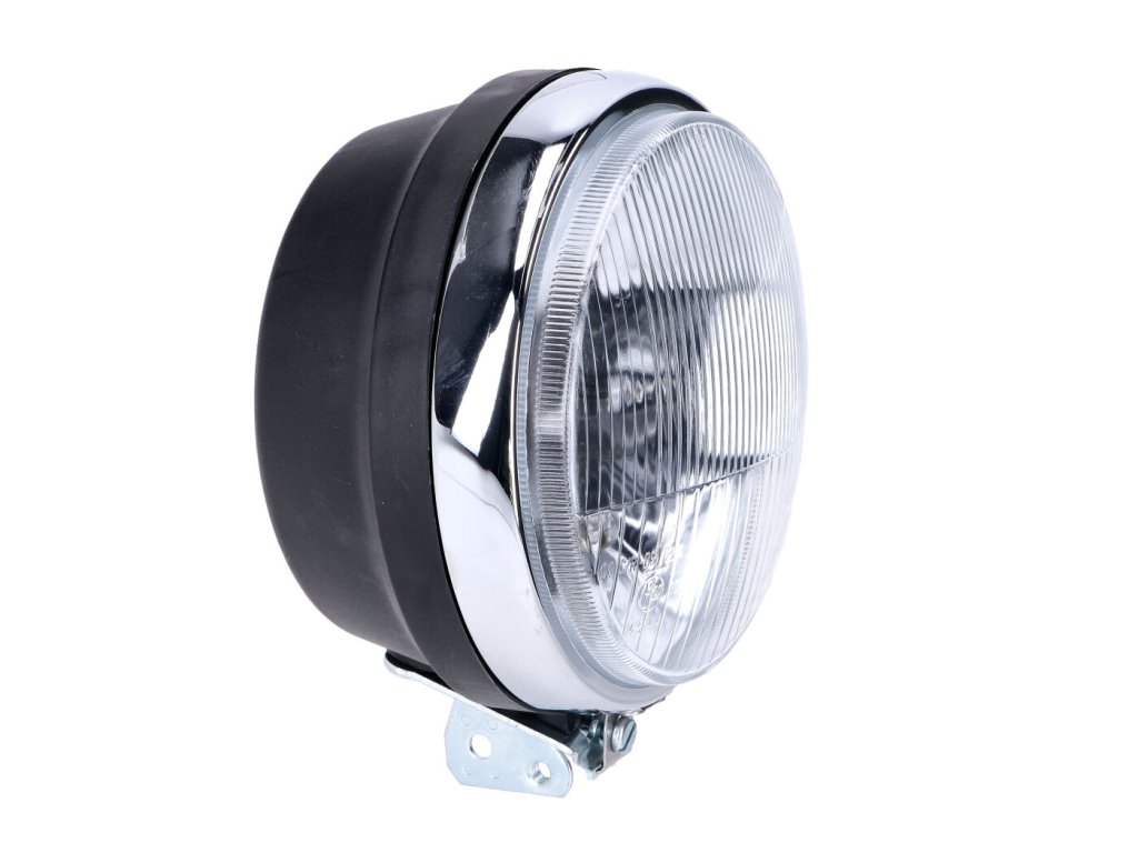 | Přední světlomet s černým plastovým krytem. Hlavní světlomet je dodáván kompletně s žárovkou 6V 35/35W a pozičním světlem 6V/4W, vhodný pro Simson S50, S51, S70. |