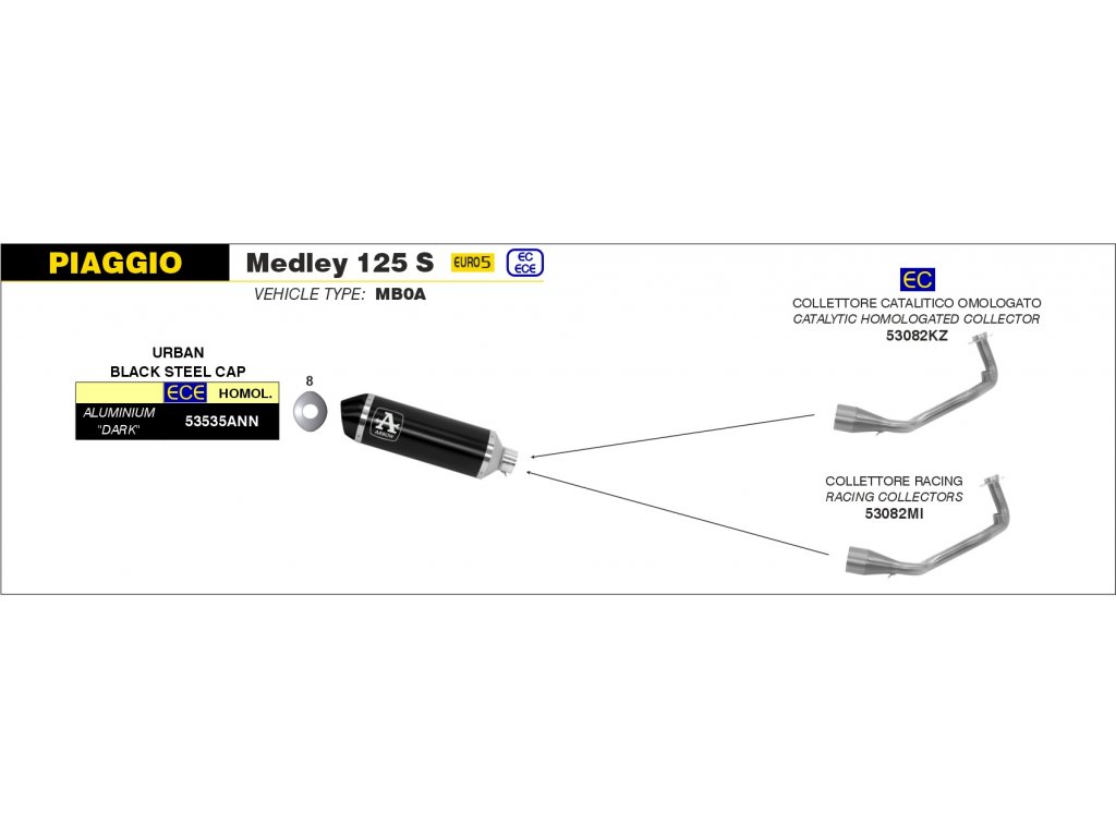 Nová koncovka Arrow Urban je novinkou, která vychází z řady Reflex 2.0. Tento tlumič výfuku je vhodný pro skútry Piaggio Medley 125, 150 E5 od roku 2020. Tlumič je vyrobený z nerezu a má hliníkovou koncovku v černé barvě. Jedná se o kvalitní výfuk, který dodá styl Vašemu skútru. Koncovka má menší hmotnost a snadno odnímatelný DB killer. Tato koncovka výfuku lze namontovat pouze ve spojení se svody 53082MI a 53082KZ s katalyzátorem.