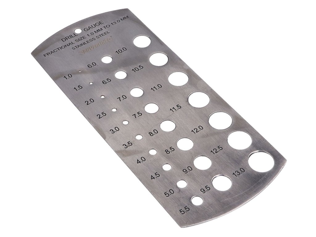Vrtací přípravek z kalené nerezové oceli. S velikostí děr od 1,0 mm do 13,0 mm. Vhodné pro určení průměru vrtáků. Pomocí vrtacího přípravku lze určit i velikost jiných kulatých předmětů.Obsah balení odpovídá produktovému obrázku.