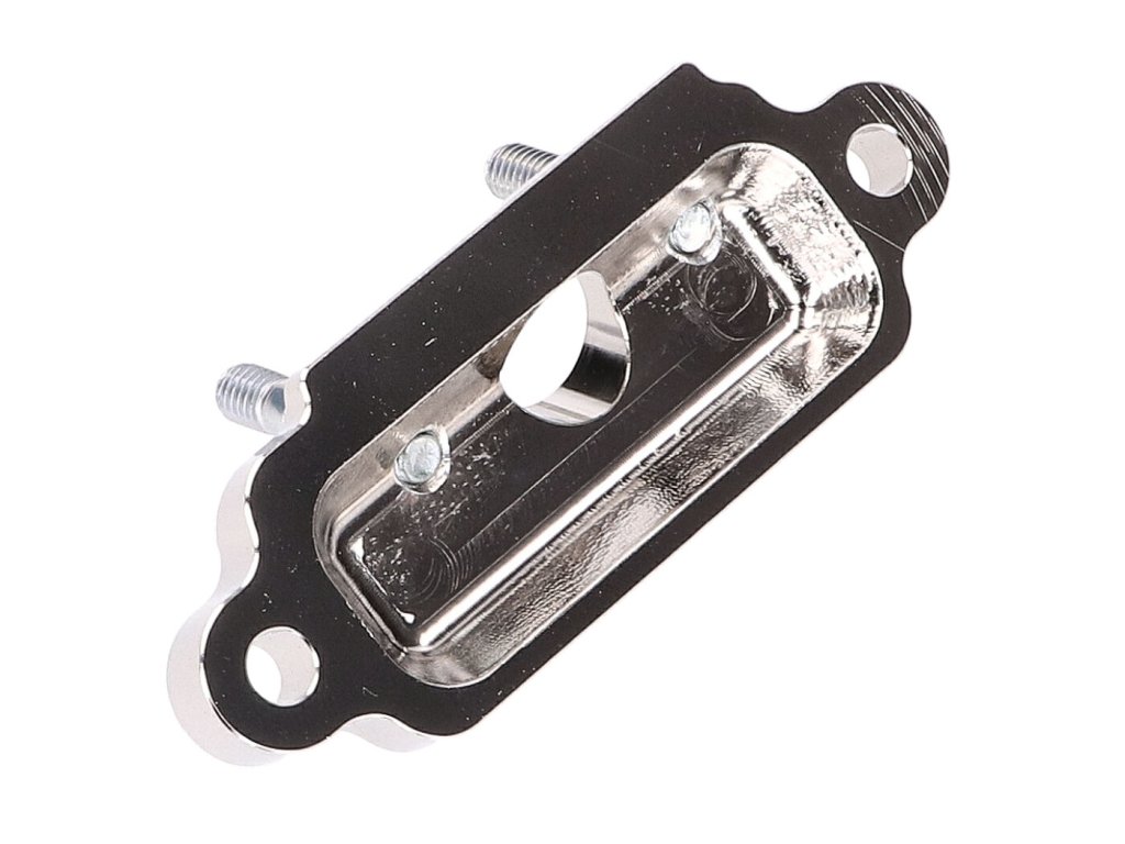 Příruba VOCA Racing precizně vyrobená pro montáž velkých PWK karburátorů na membránový blok, vhodná pro Minarelli AM6 a Derbi D50B.
