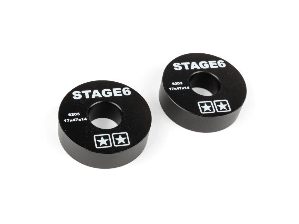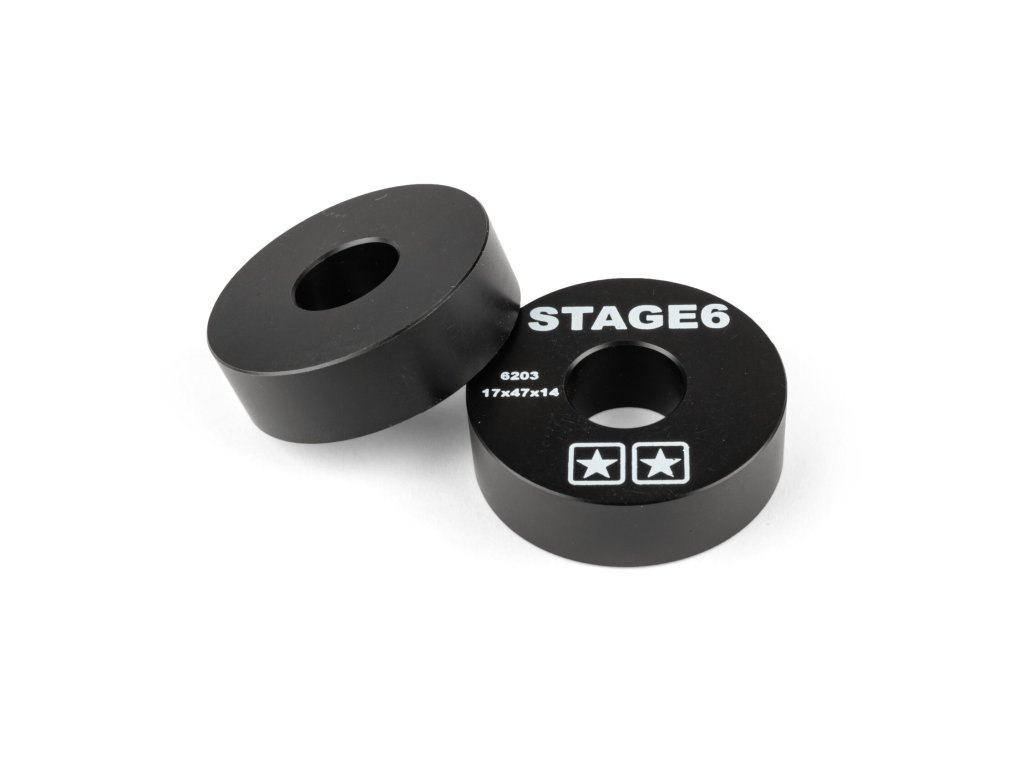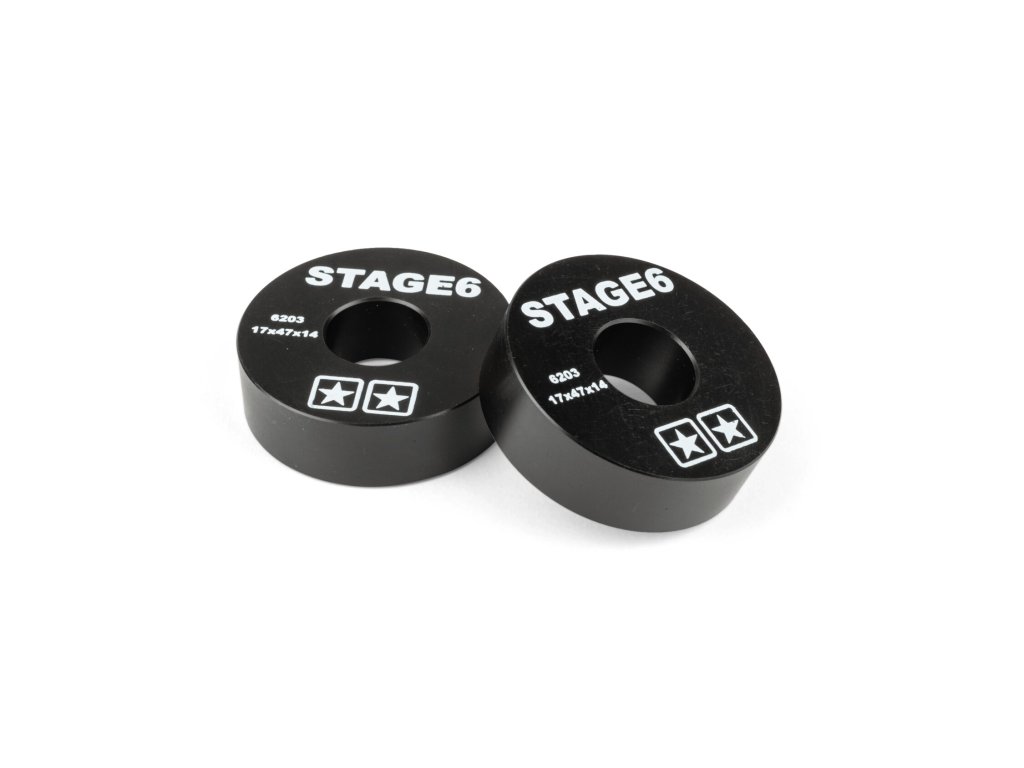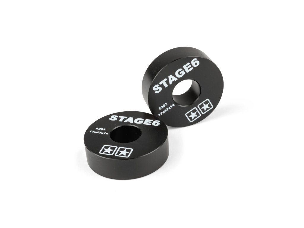 Stage6 náhrada ložisek pro klikovou hřídel je vyroben z POM (polyoxymethylen), který se vyznačuje vysokou pevností a tuhostí a má velmi nízký koeficient tření. Černé náhrady jsou opatřeny bílým logem Stage6, kódem ložiska a velikostí ložiska. Prodává se v páru.