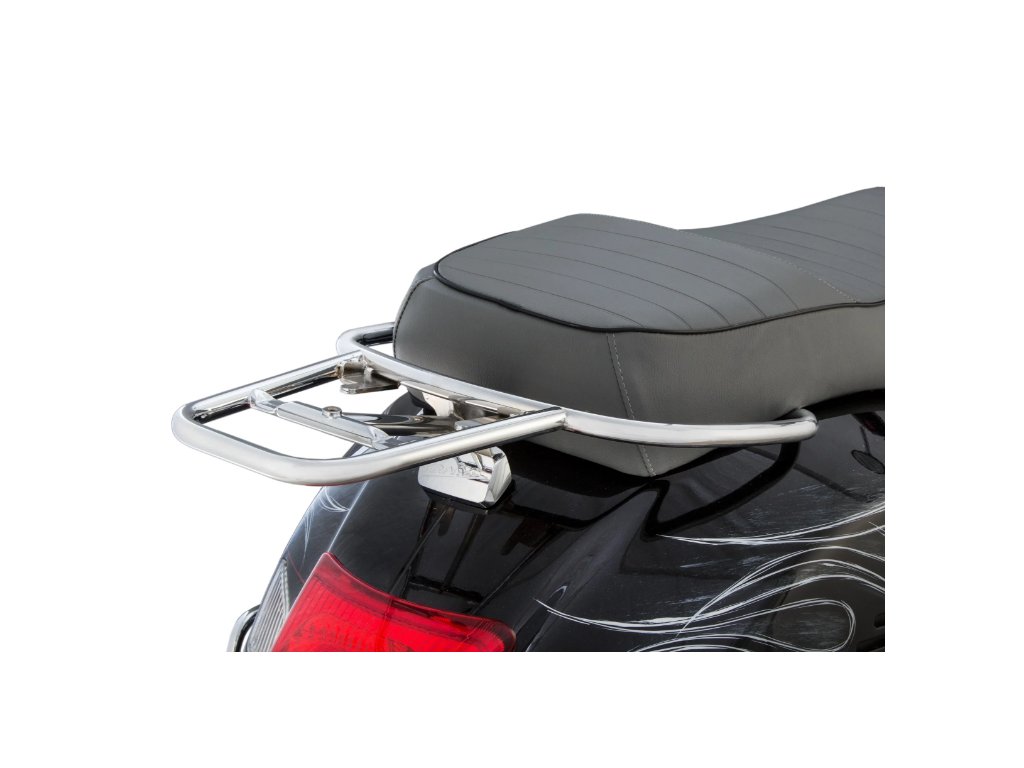 Kvalitní nosič zadního kufru Piaggio F.A. Italia, v chromovém provedení. Vhodné pro skútry Vespa GTS / GTV 125 / 300 ccm. OEM číslo: 657081.