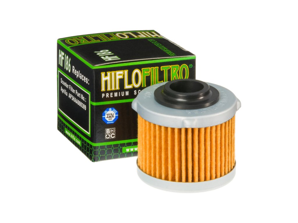 Kvalitní olejový filtr Hiflofiltro HF186, vhodný na skútry Aprilia 125, 200 Scarabeo a Italjet Dragster 125 / 200 od roku 2022.