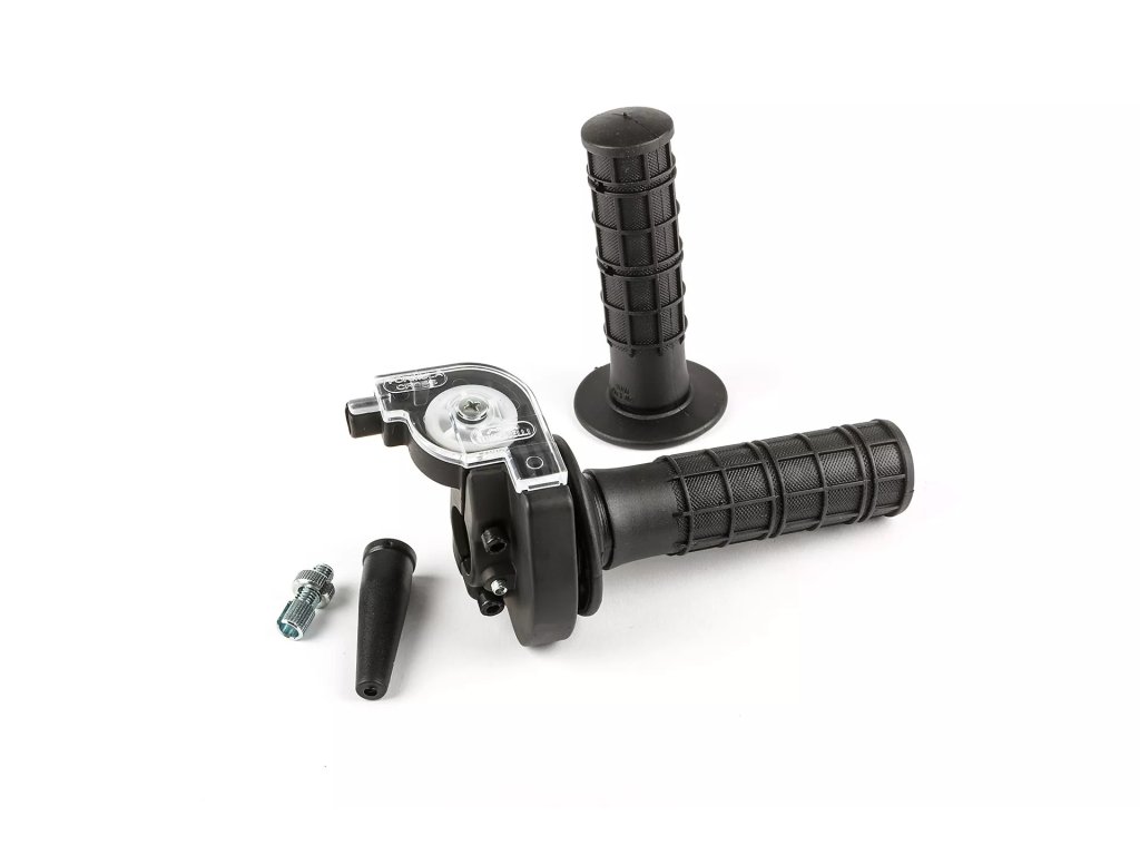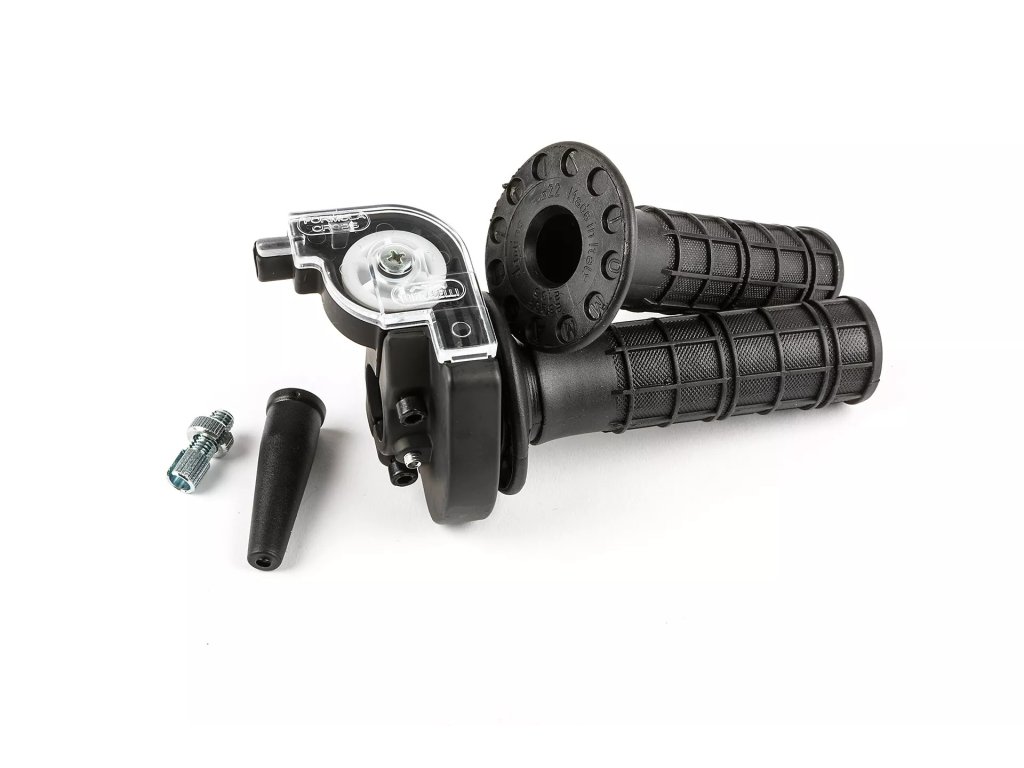 Ovladač plynu "rychlopal" Tommaselli, černá, vodorovný (48 mm/75°- 2 °/mm). Tak zvaný rychlý plyn "rychlopal" má největší výhodu v tom, že lanko jde přes kladku, která má daleko menší odpor než originální rukojeť plynu. Velmi užitečná věc pro skútry s velkými karburátory. K dostání v černém nebo kovovém provedení. Toto provedení má přímě vyvedený vývod. Údaj v závorce znamená, že při takovém otočení rukojetě, se tak zatáhne lanko.