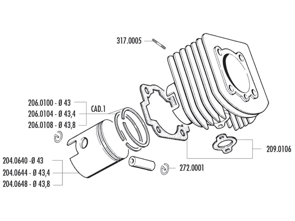 Pístní sada 63ccm Polini v top kvalitě. Průměr pístu je 43,8mm a pístního čepu 12mm, tato pístní sada je vhodná pro stroje Piaggio, Vespa AL, ALX, NLX a Vespino. V sadě je píst, pístní kroužky, pístní čep a segrovky.Doplňkové parametry