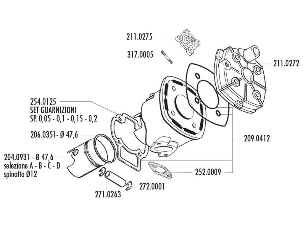 Pístní sada 70ccm Polini Racing Evolution v top kvalitě. Průměr pístu je 47,6mm (B) a pístního čepu 12mm, tato pístní sada je vhodná pro motory Piaggio, Minarelli. V sadě je píst, pístní kroužek, pístní čep a segrovky.Doplňkové parametry