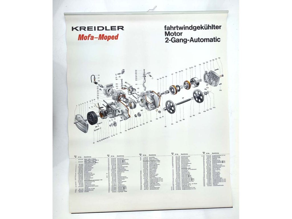 Originální dílenský reklamní plakát pro prodejce s rozstřelovým výkresem, vhodné pro Kreidler MF MP Flory s 2rychlostním automatickým motorem. Rozměry: Š cca 600 mm, V cca 730 mm. Ze starých skladových zásob, s nečistotami, rzí a škrábanci.