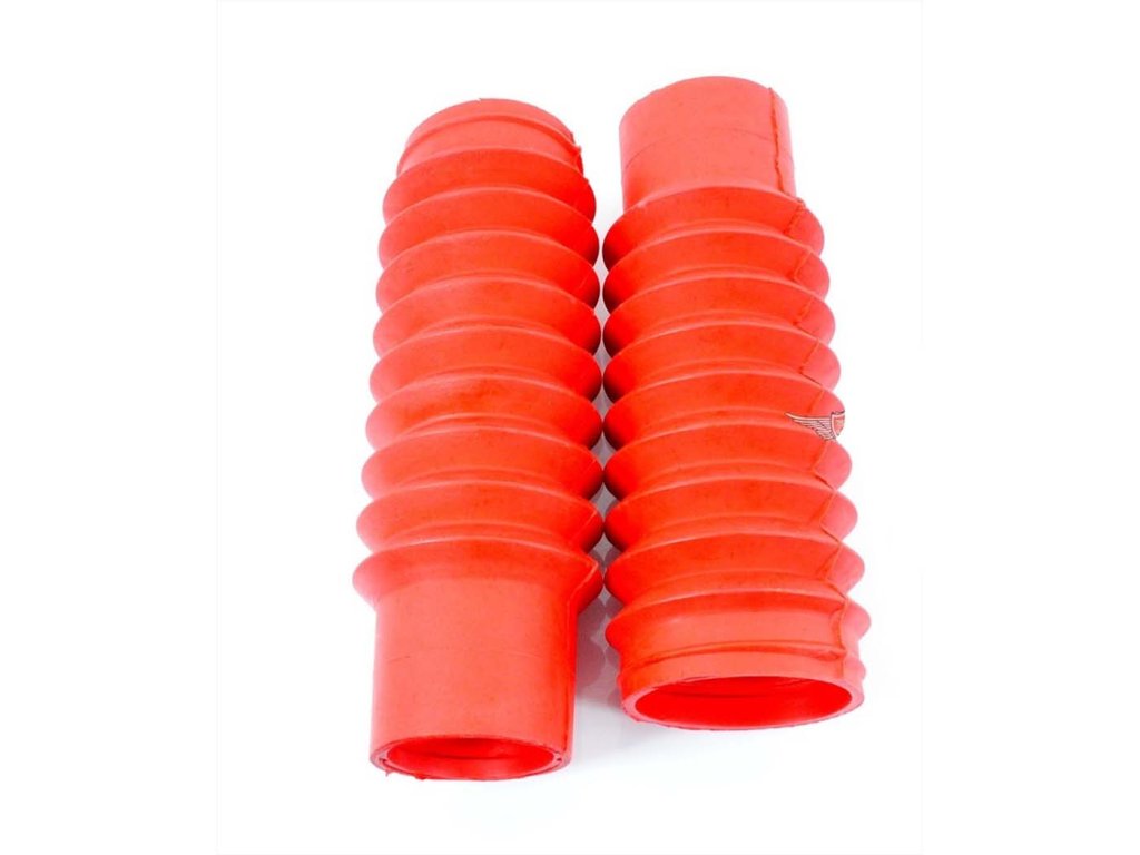 Červená sada (2 kusy) prachovek teleskopické vidlice pro různé Yamaha RD 50 80 FS 1, rozměry: cca 40/45 mm, délka cca 165 mm.