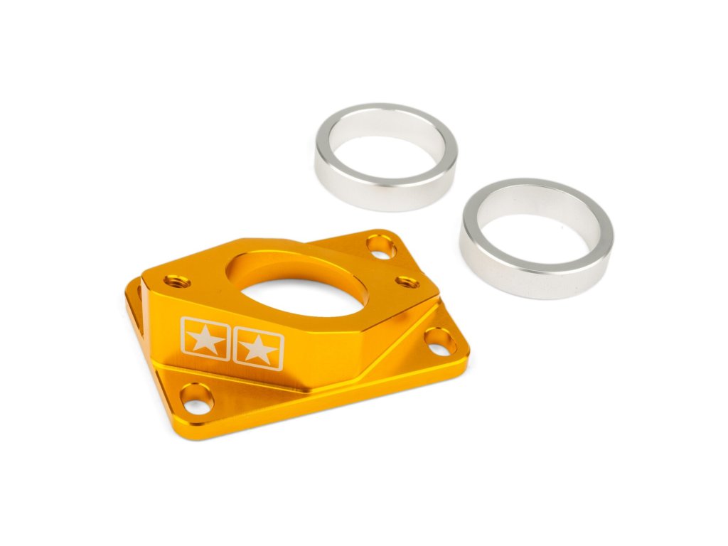 High Flow příruba je vyrobena z vysoce kvalitního hliníku s bezchybným vzhledem díky CNC technologii. Je barevně eloxovaná a opatřená laserem gravírovaným logem Stage6. Je ideální pro tuning a závody; lehce klínovitý tvar usnadňuje použití většího karburátoru. Díky úhlu sklonu lze karburátor na levé straně motocyklu nově nastavit a nasměrovat tak, aby bylo možné použít větší sání s rozměrnějším závodním vzduchovým filtrem.