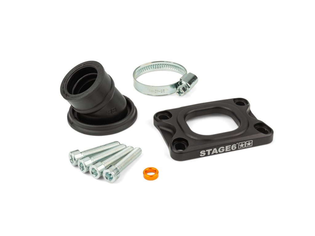 Sací systém Stage6 R/T High-Flow pro Minarelli AM6 a Derbi zlepšuje průtok a výkon. Umožňuje větší karburátor, nastavení úhlu a má vyměnitelné vložky.