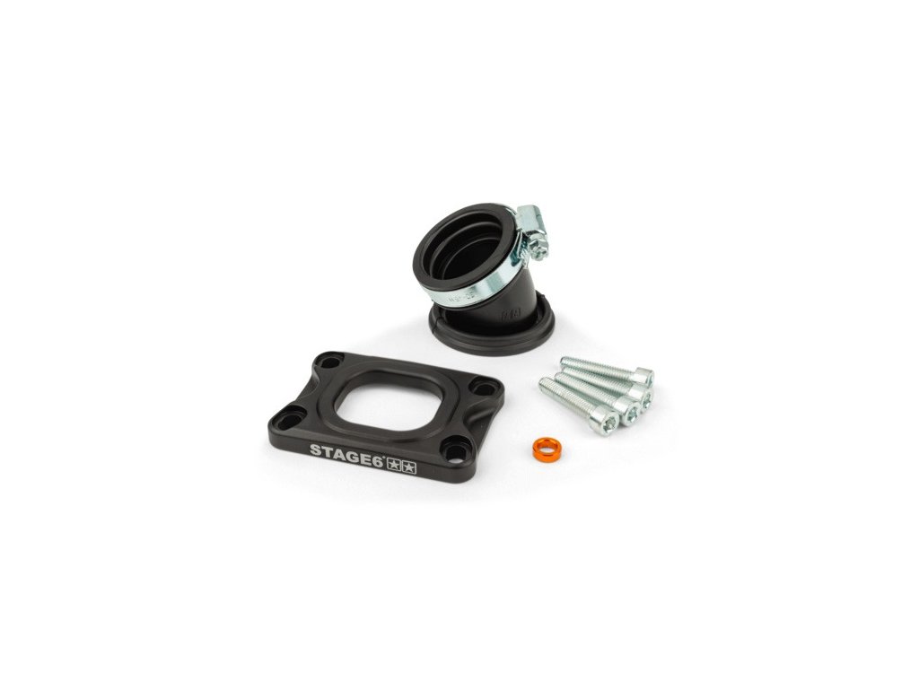 Sací systém Stage6 R/T High-Flow pro Minarelli AM6 a Derbi zlepšuje průtok a výkon. Umožňuje větší karburátor, nastavení úhlu a má vyměnitelné vložky.