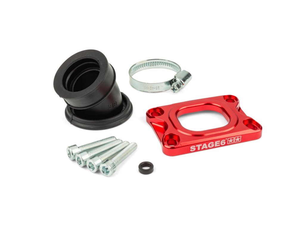 Podložka Stage6 pro Derbi a AM6 zlepšuje výkon nasměrováním proudění a prodloužením sání. Hodí se pro běžné membránové bloky i různé setupy.