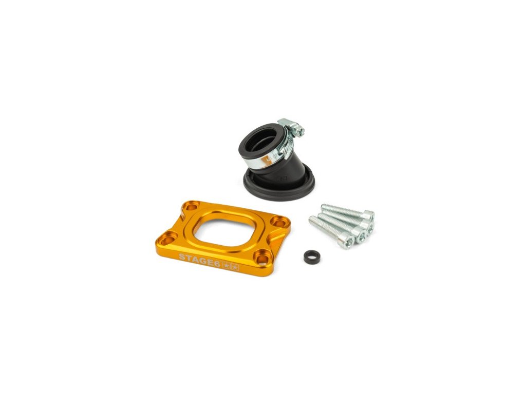 360° příruba Stage6 pro AM6 a Derbi zvyšuje výkon a umožňuje flexibilní natočení karburátoru. Kvalitní díly, přesné usazení a těsnost.