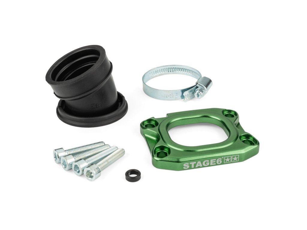 Příruba Stage6 High Flow pro AM6 a Derbi zlepšuje průtok směsi, usnadňuje montáž většího karburátoru a filtru, přináší lepší zrychlení a výkon