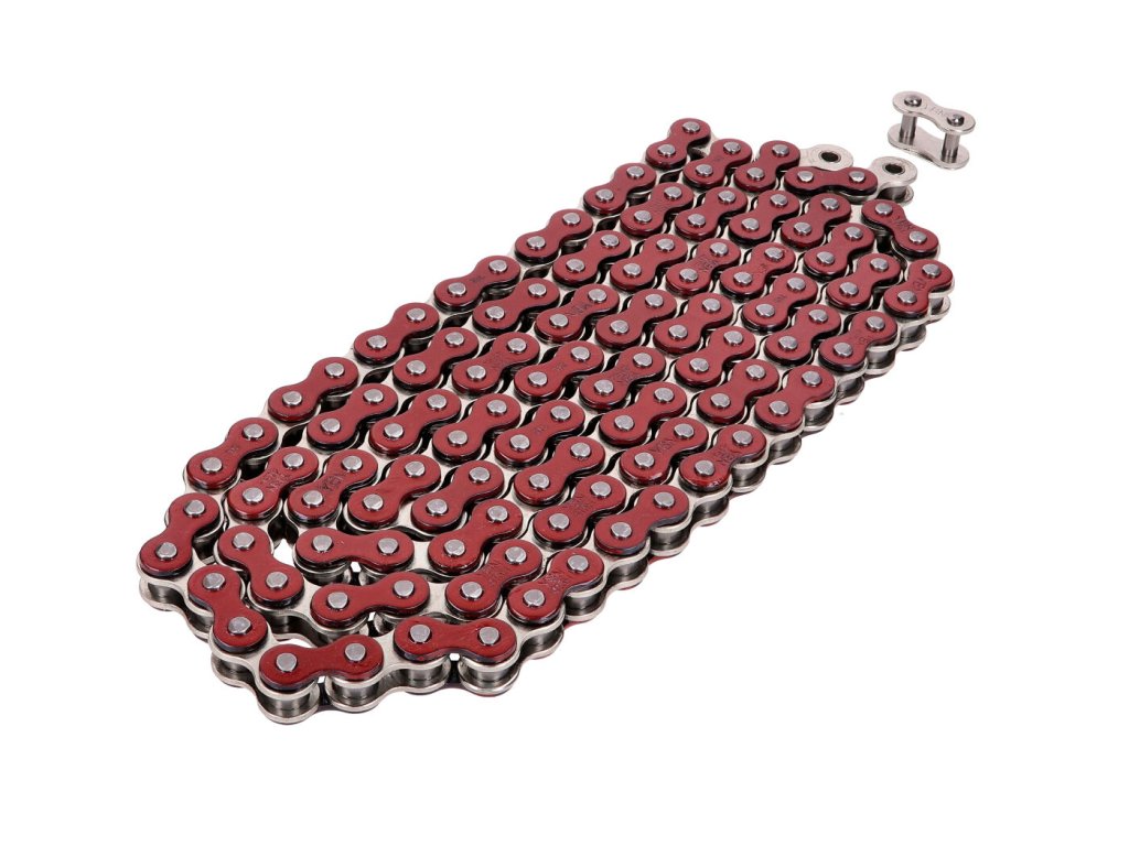 Řetěz v zesíleném provedení s roztečí 420 x 140 článků (420 1/2 x 1/4) v červené barvě. Průměr válečku na článku je 7,87 mm.