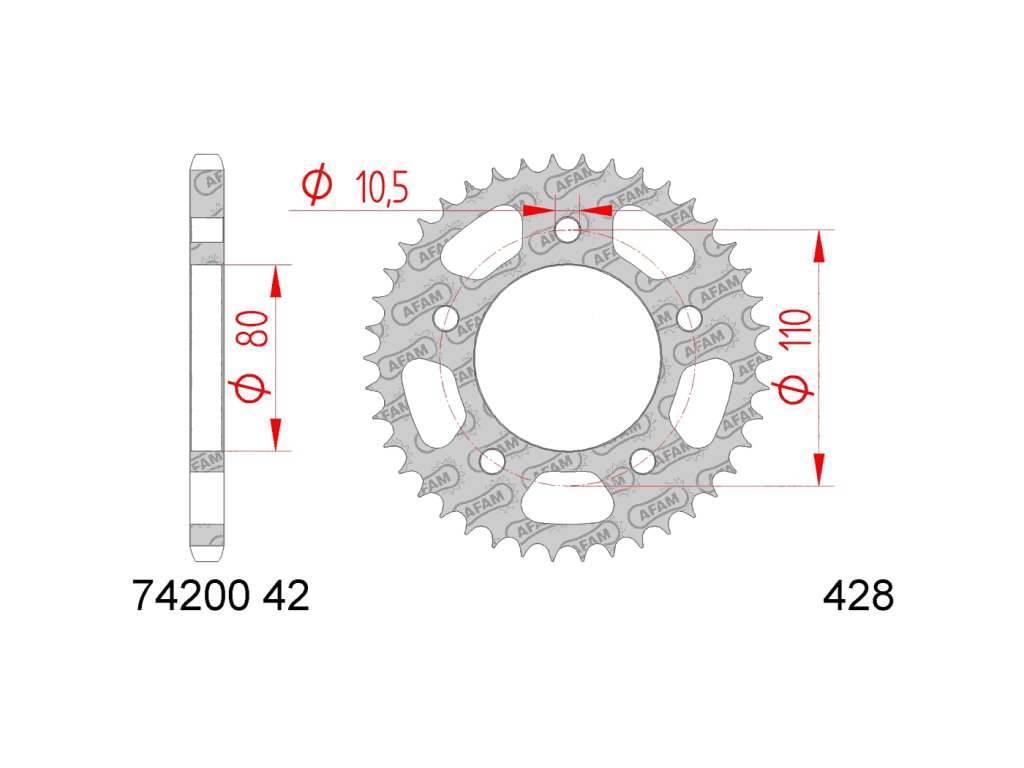 Vysoce kvalitní rozeta (typ 428) od značky AFAM, má 42 zubů a je vhodná pro stroje Kymco Quannon 125. Vnitřní průměr: 80mm, průměr ke šroubům: 110mm, průměr děr: 10,5mm.Doplňkové parametry