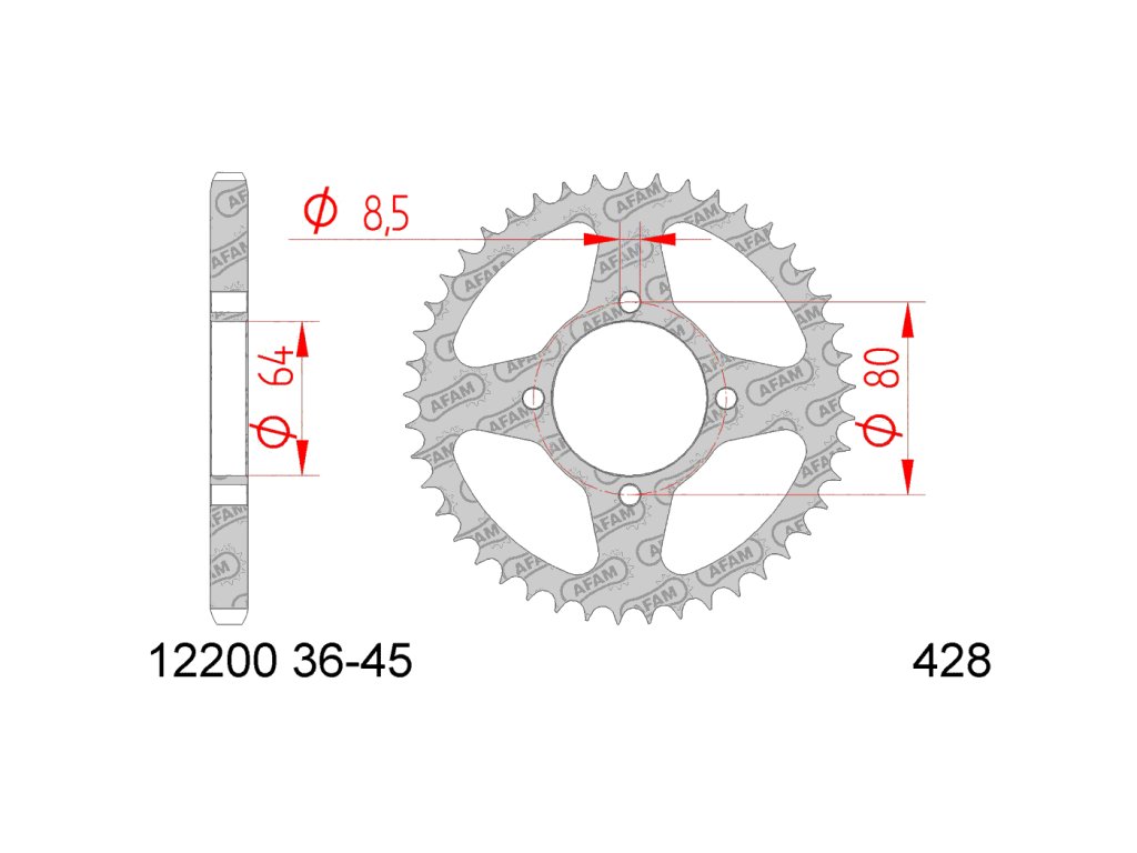 Vysoce kvalitní rozeta (typ 428) od značky AFAM, má 43 zubů a je vhodná pro stroje SYM XS 125 K, Yamaha RD, YBR 125. Vnitřní průměr: 64mm, průměr ke šroubům: 80mm, průměr děr: 8,5mm.Doplňkové parametry