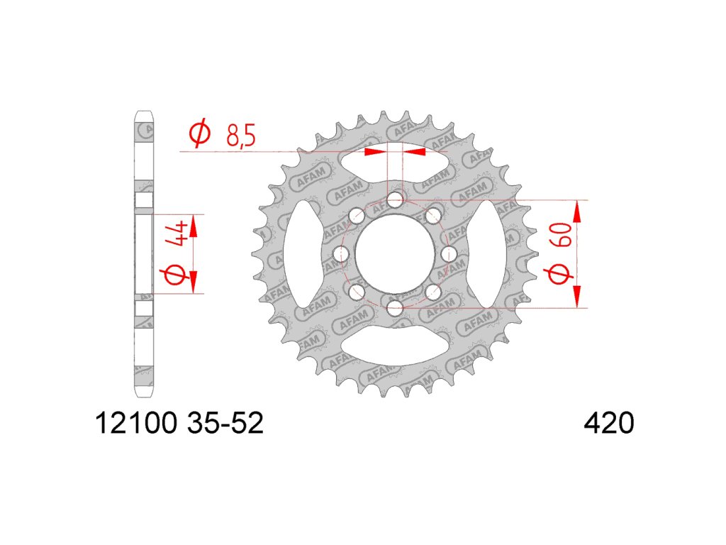 Vysoce kvalitní rozeta (typ 420) od značky AFAM, má 48 zubů a je vhodná pro stroje MBK X-Limit do roku 1992, Yamaha DT, FS1, Chappy, RD. Vnitřní průměr: 44mm, průměr ke šroubům: 60mm, průměr děr: 8,5mm.Doplňkové parametry