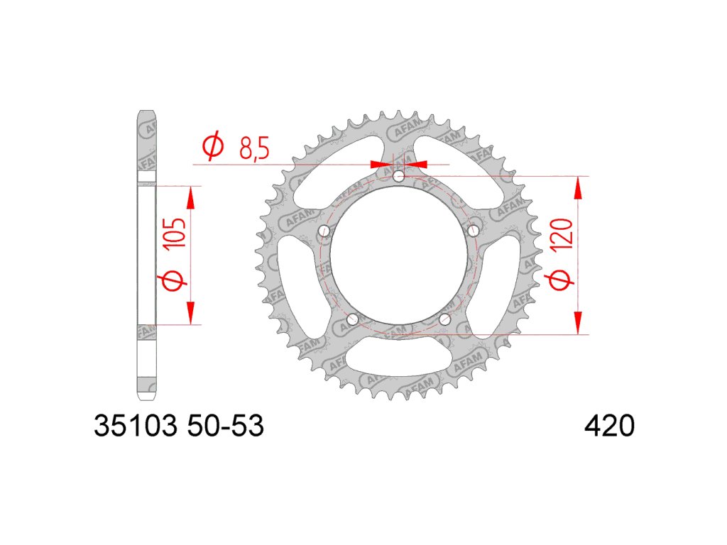 Vysoce kvalitní rozeta (typ 420) od značky AFAM, má 51 zubů a je vhodná pro stroje Aprilia MX, RX do roku 2005, Generic Trigger, DT50, X-Limit. Vnitřní průměr: 105mm, průměr ke šroubům: 120mm, průměr děr: 8,5mm.Doplňkové parametry
