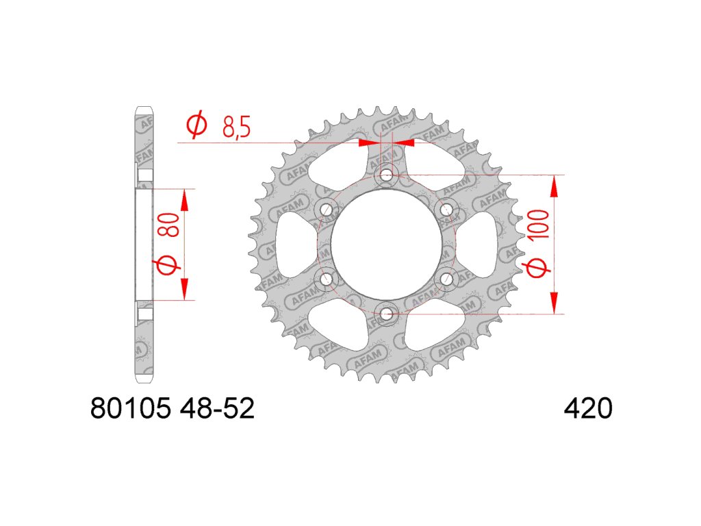 Vysoce kvalitní rozeta (typ 420) od značky AFAM, má 52 zubů a je vhodná pro stroje Rieju Spike, RR do roku 2005. Vnitřní průměr: 80mm, průměr ke šroubům: 100mm, průměr děr: 8,5mm.Doplňkové parametry
