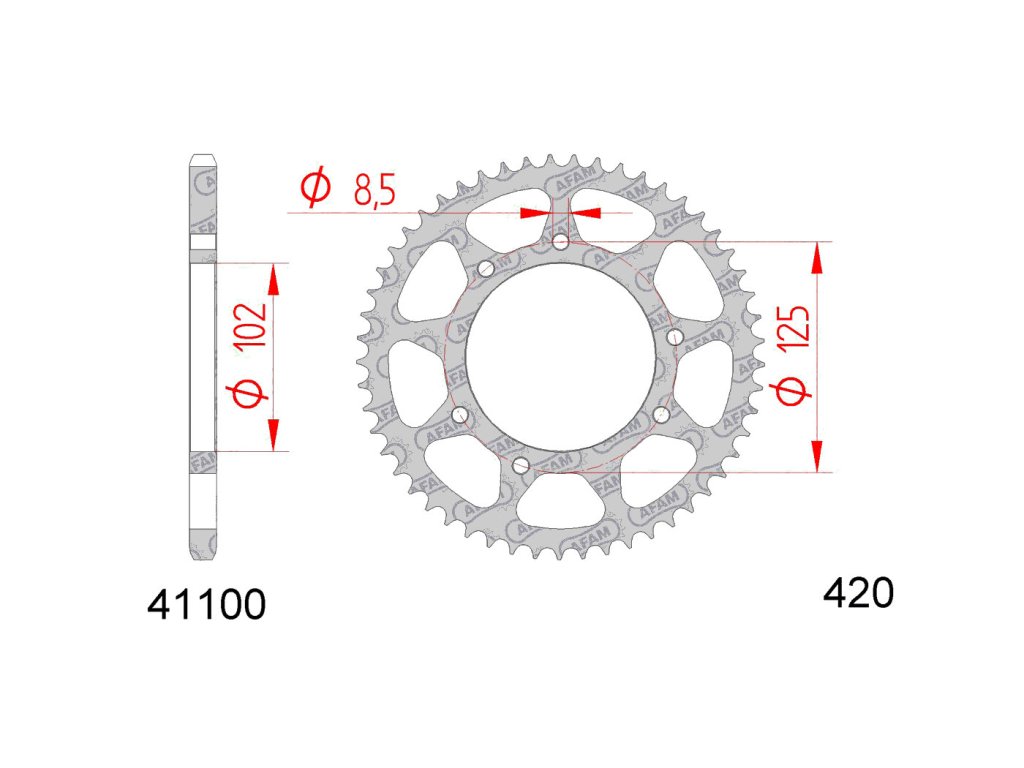 Vysoce kvalitní rozeta (typ 420) od značky AFAM, má 59 zubů a je vhodná pro stroje Aprilia RX50, Senda X-Treme a Gilera RCR od roku 2018. Vnitřní průměr: 102mm, průměr ke šroubům: 125mm, průměr děr: 8,5mm.Doplňkové parametry