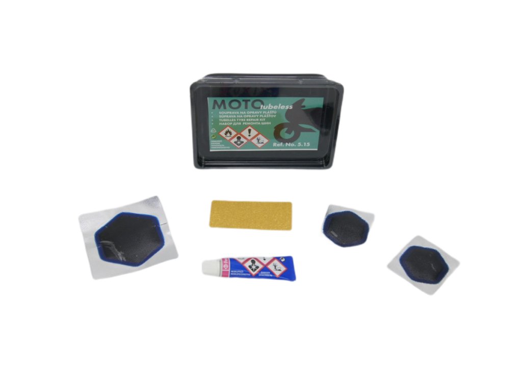 Souprava na opravu duší určená pro opravu malých defektů bezdušových plášťů motocyklů, k rychlému a efektivnímu vyřešení defektu, v praktickém plastovém boxu.