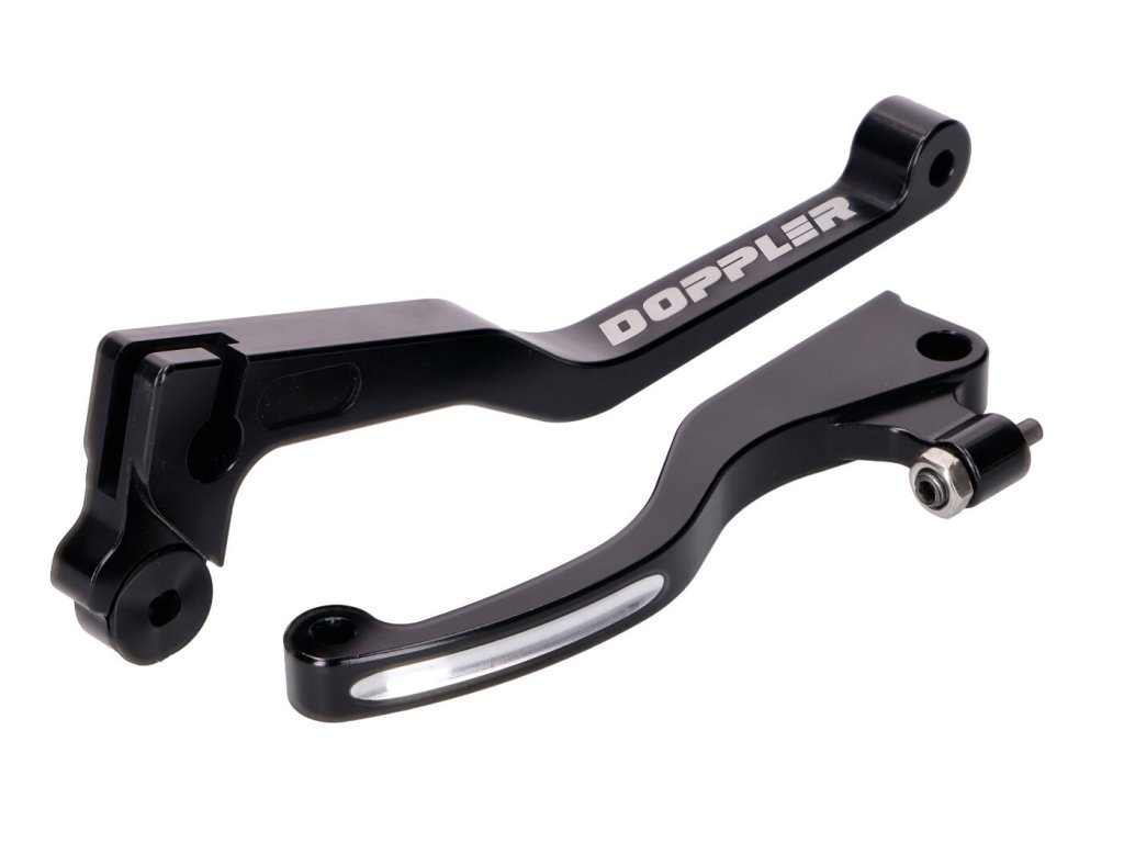 Sada velmi pohledných CNC frézovaných páček Doppler v černé barvě s elegantním finišem a bílým logem Doppler: Sada s 1x brzdovou páčkou a 1x spojkovou páčkou, vhodná pro Derbi Senda 50 DRD Pro a některé modely Derbi 125. Plug-and-play montáž bez nutnosti úprav. Stačí vyměnit a hotovo.