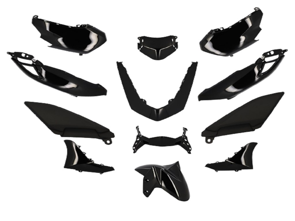 Sada dílů kapotáže v lesklé černé barvě vhodná pro skůtry Yamaha N-Max 125, 155i od modelového roku 2021. Sada obsahuje dvanáct dílů.Obsah balení odpovídá pruduktovému obrázku.