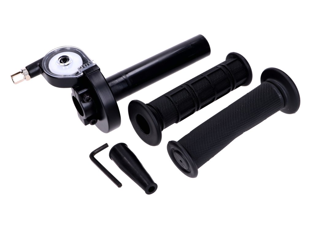 Sada rychlopalu z černého hliníku s černými gripy, vhodná pro Moped, skútr, čtyřkolku a ATV s průměrem řídítek 22 mm.