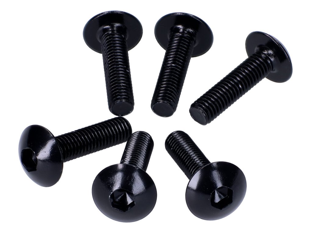 Kompletní sada upevňovacích šroubů pro boční kapotáž v černé barvě, vhodná pro Puch Maxi N Mofas a Mopedy. Šrouby mají černé plastové hlavy.