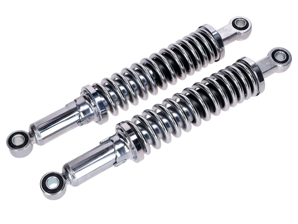 Sada 335 mm chromových sportovních tlumičů, hydraulicky tlumené a 5násobně nastavitelné, vhodné pro Honda MB, MT, Zündapp, Hercules, Kreidler, Puch a mnoho dalších modelů.