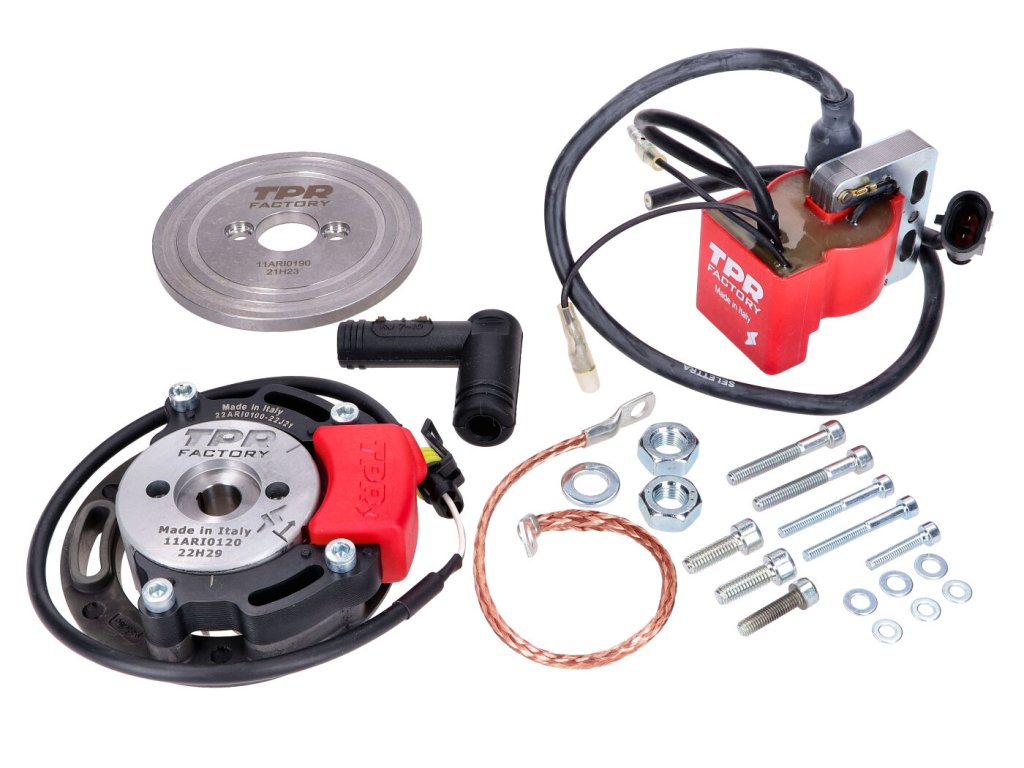 Sada vnitřního rotorového zapalování od TPR Factory s průměrem 58 mm, vhodná pro stroje s motorem Minarelli AM6 podle norem E2, E3, E4 od Aprilia, Beta, Derbi, Peugeot, Rieju a Yamaha.