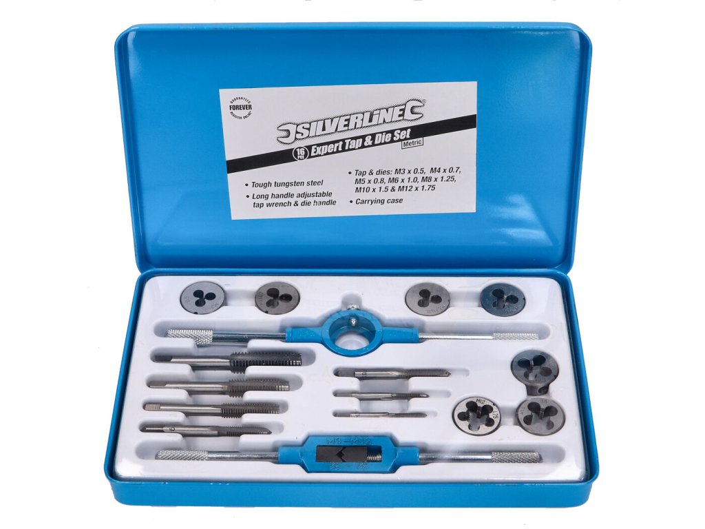 16dílná sada metrického závitového nářadí. Profesionální kvalita z wolframové oceli v kovovém pouzdře.Sada obsahuje nastavitelný závitořezný klíč s dlouhou rukojetí a držák matric.