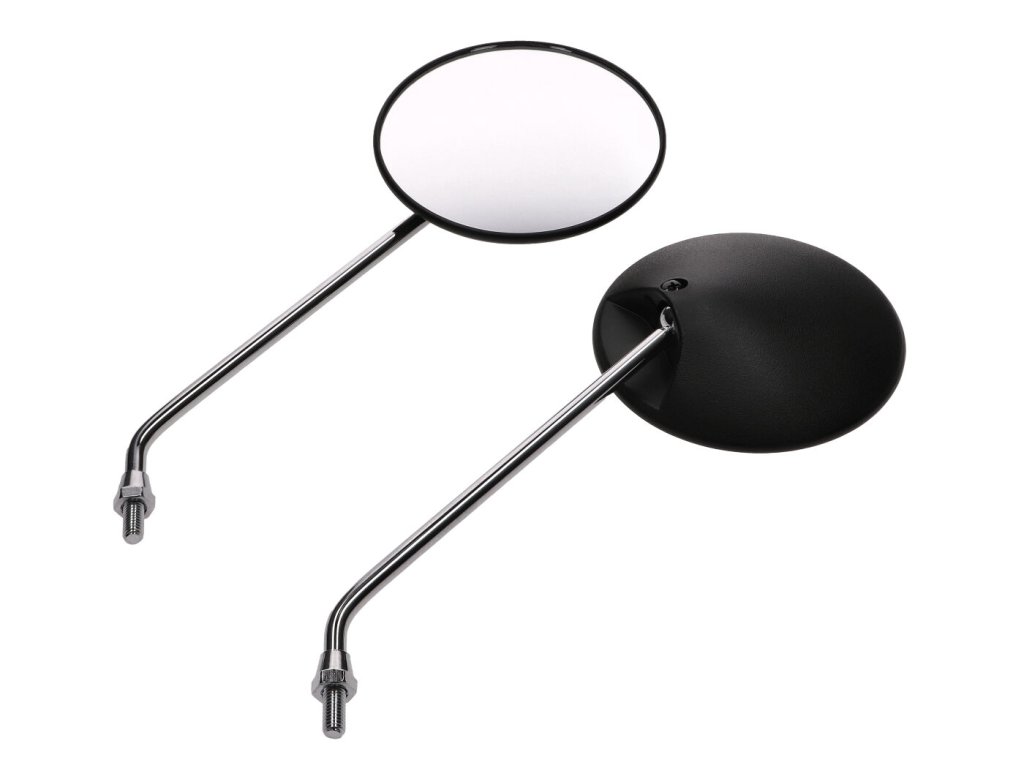 Sada kulatých zpětných zrcátek s průměrem 120 mm. Zrcátka mají plastovou zadní stranu, v černé barvě a chromovou tyčku. Matice mají závit M8 a jsou vhodné na levou i pravou stranu. Sklíčka zrcátek jsou vyměnitelné.