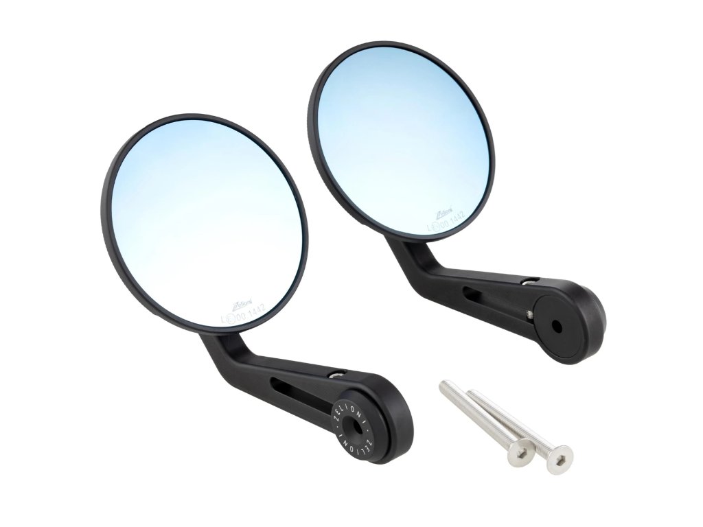 Stylové zrcátka na koncovky řídítek Zelioni. Zrcátka jsou vhodné na skútry Vespa ET, LX, LXV, S, GTS, GTS Super, GTV, GT 60, GT a GT L. Zrcátka jsou v matně černém eloxu a mají kulatý tvar. Zrcátko je vyrobené z kvalitního hliníku. Průměr zrcátka: 95 mm, délka ramínka: 105 mm.