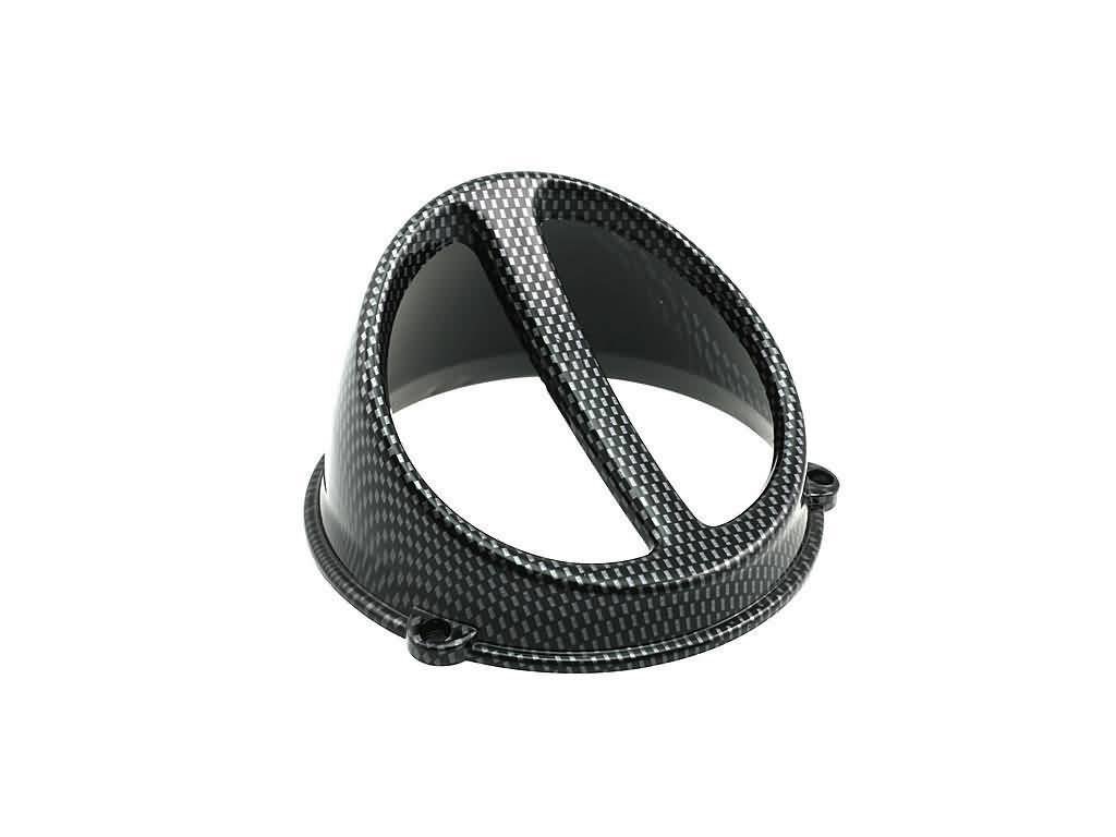 Univerzální spoiler náhonu vzduchu, je ve vzhledu karbonu a je vhodný pro všechny 50ccm vzduchem chlazené motory. Tento spoiler zlepšuje chlazení Vašeho stroje. Uchycení je pomocí 3 šroubů. Vnější průměr 126mm, vnitřní 110mm.