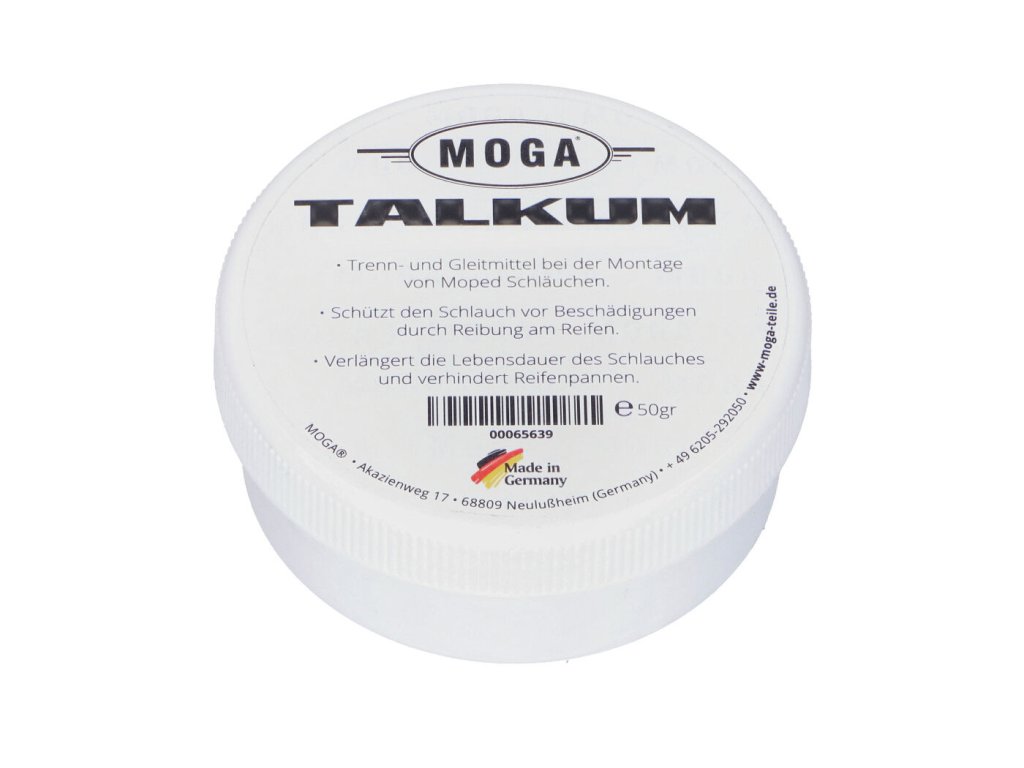 Talcum MOGA plechovka 50 g pro Hercules Prima, M, MK, K, KX, Ultra, Hobby Rider, Zündapp GTS, KS, CS, CX, Hai, C 50, Combinette, Bergsteiger, R Z, Kreidler Florett, Flory, MF, MP, Simson Schwalbe, S, SR, KR, Puch Maxi, Monza, X, Racing, Jet, Ranger,