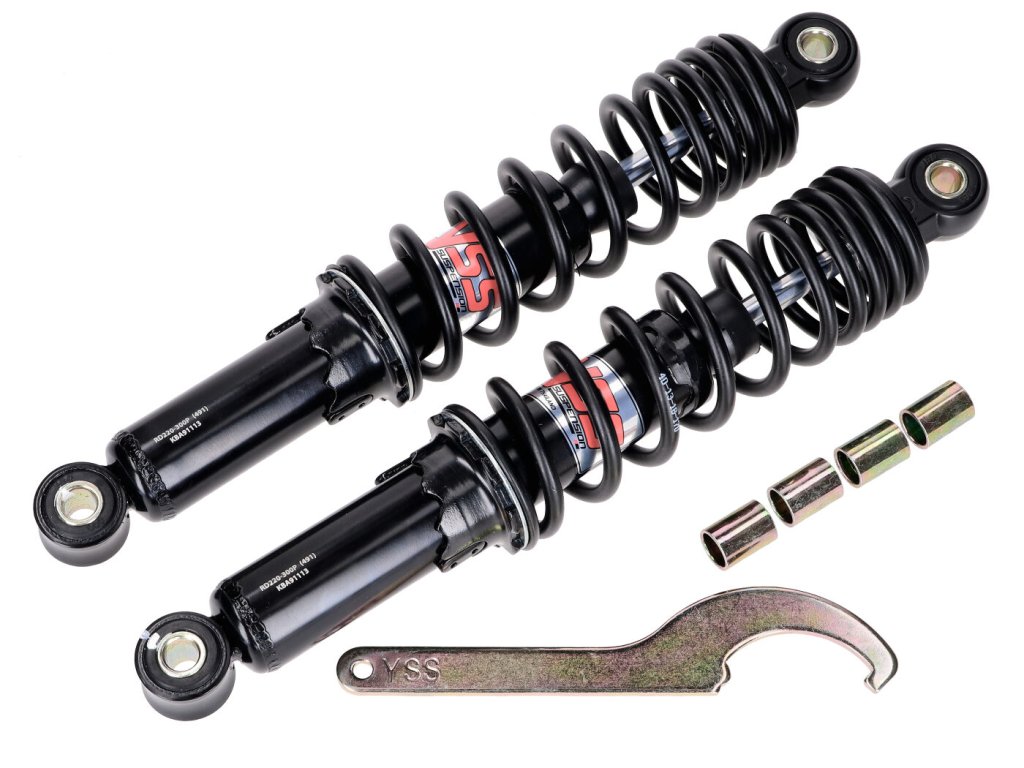 Hydraulicky tlumené, 5násobně nastavitelné, progresivní kvalitní tlumiče YSS s délkou 300 mm (od oka k oku) a 10mm upevňovacími pouzdry nahoře i dole