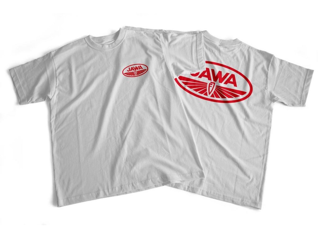 Bílé bavlněné tričko s potiskem loga JAWA František Janeček (FJ) na srdci na zádech. Logo JAWA je na tričku natisknuto semišovým „chlupatým“ termotransferovým flock potiskem.